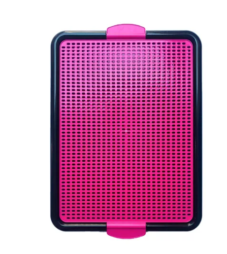 Este sanitário é apropriado para cães de pequeno e médio porte, tem uma grade na parte superior e um reservatório na parte inferior e duas travas laterais junto as abas.